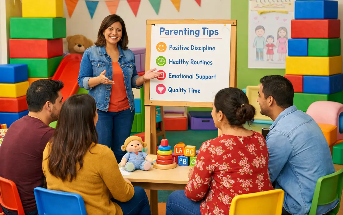 Workshops, webinars, and counseling cover discipline, routines, nutrition, screen time, and emotional intelligence.